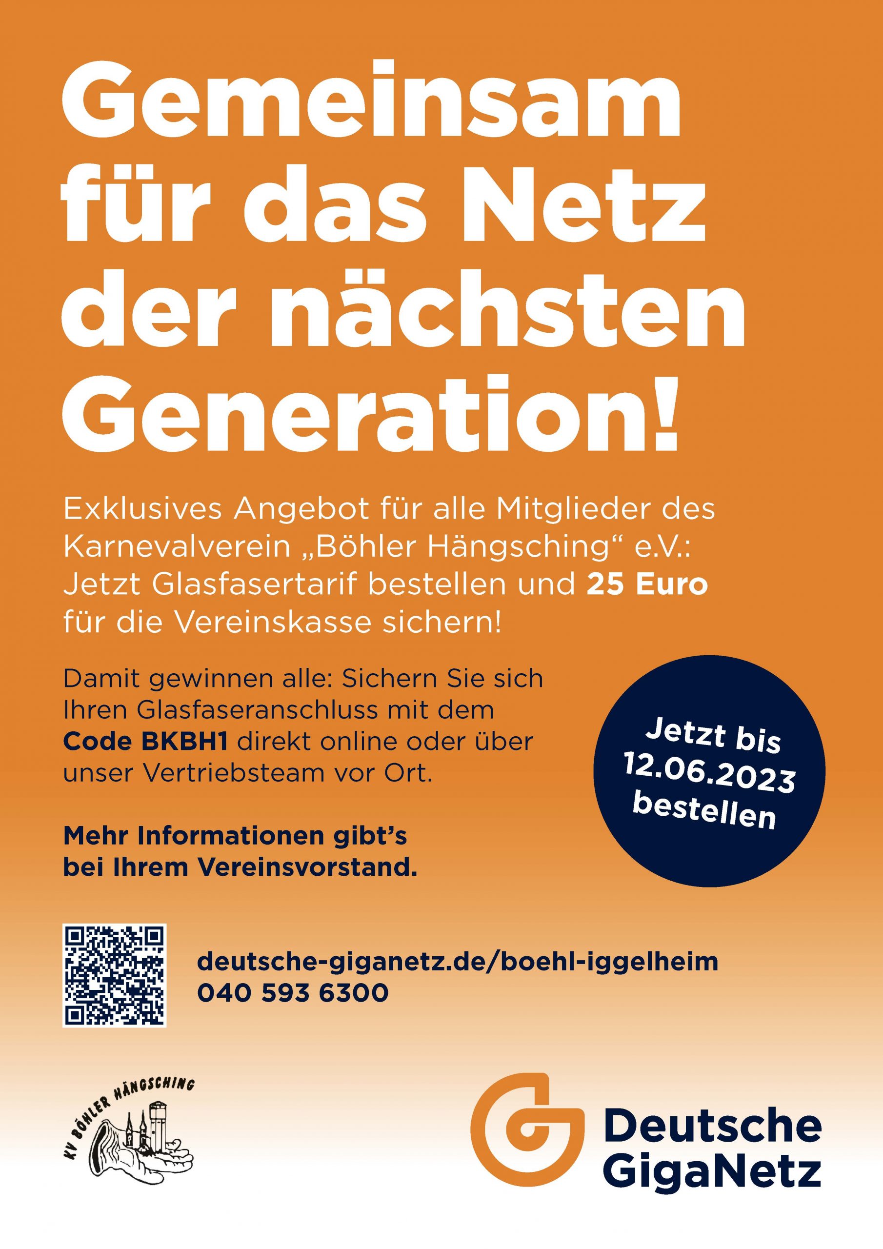 Dabei können wir doppelt profitieren: Ihr startet mit dem Glasfaser-Internet in die digitale Zukunft und die Deutsche GigaNetz zahlt unserem Verein dafür nach Vertragsabschluss pro Vertrag 25 Euro. Dazu schließt Ihr den Glasfaser-Anschluss direkt online ab, profitiert von bis zu 60 Euro Online-Preisvorteil und gebt bei der Buchung den Code BKBH1 ein oder wendet euch an die Vertriebsmitarbeitenden der Deutschen GigaNetz vor Ort.